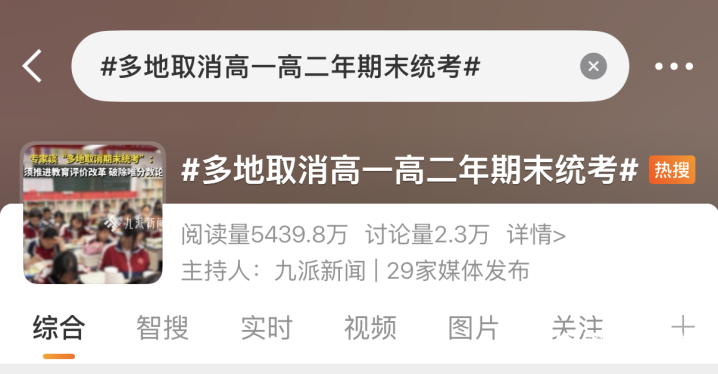 社交平台“多地取消高一高二期末统考”热搜话题截图。
