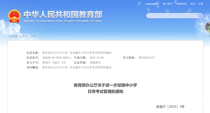 教育部办公厅印发关于进一步加强中小学日常考试管理的通知。