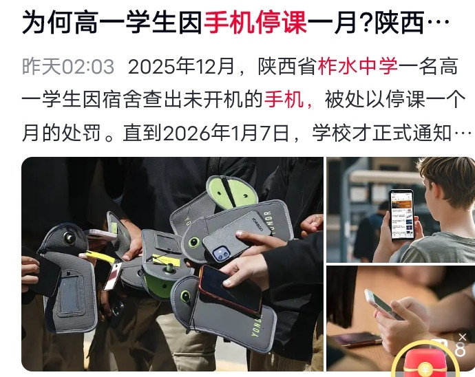 2026年1月,陕西省柞水中学一起学生手机管理事件引发教育圈热议。一名学生违规将手机带入宿舍,校方依据《柞水中学学生宿舍管理条例》第12条“禁止携带电子产品入舍,首次违规批评教育,多次违规停课反思”的规定,给予其停课一个月的处分。家长向媒体爆料后,事件迅速登上社交平台热搜,在舆情持续关注下,校方调整处理方案,允许学生返校复课。