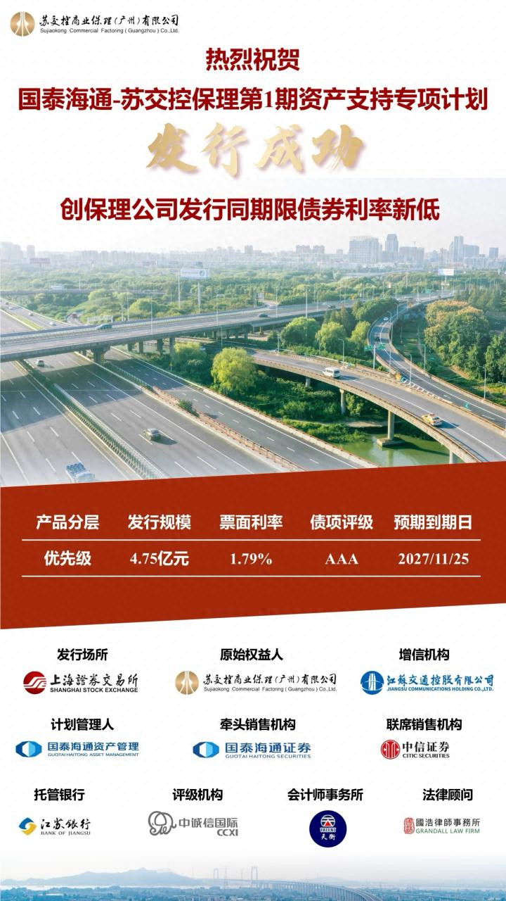 在“十五五”规划开局之年,交控保理于1月20日,在上海证券交易所成功发行首单资产证券化产品“国泰海通-苏交控保理第1期资产支持专项计划”,优先级票面利率为1.79%,创保理公司发行同期限债券利率新低。
