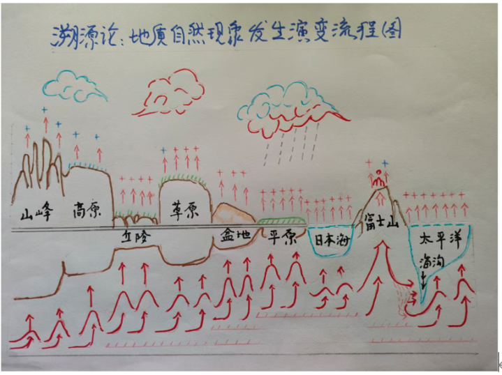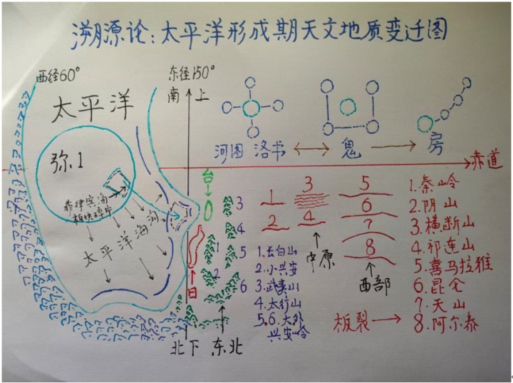 弥1向北冲撞重力与惯性。前线运行受阻增多。。转向西朔标的的地幔地壳。形成太平洋西海岸。多处地幔地壳出现。由东北至西南斜形走向的地壳板裂,致使多数岩浆涌出。形成日本、琉球、台湾各山系。以及武夷山太行山。长白山。大、小、外兴安岭等相关山脉的出现。