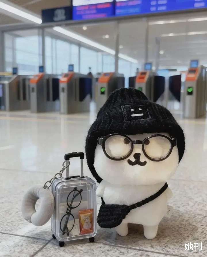在启航的高铁站、车站、机场里,玩偶们拖着小小行李箱,向着未知的路径蓄势待发。