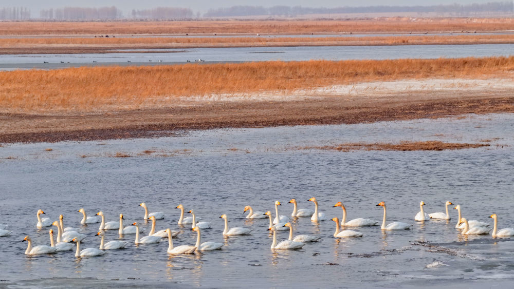 北归的天鹅在吉林省莫莫格国度级当然保护区内游弋。新华社发(潘晟昱 摄)