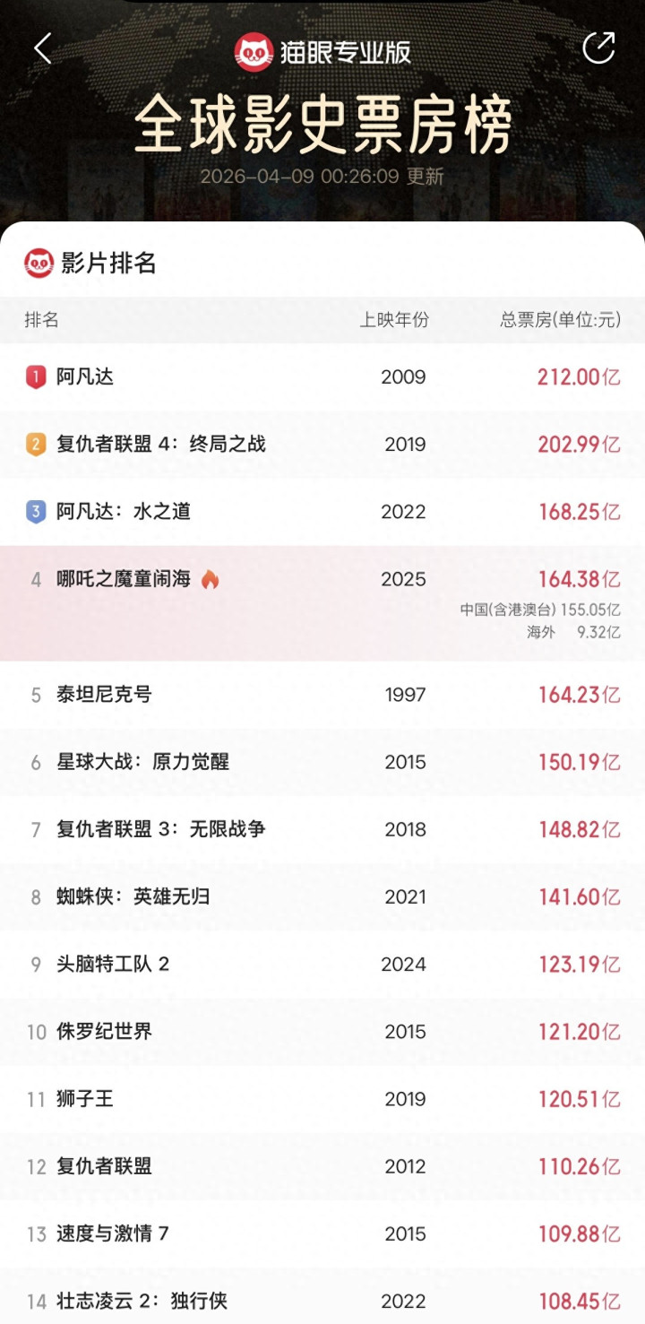 《哪吒之魔童闹海》(下称《哪吒2》)票房又破记录了。为止4月8日,猫眼专科版数据泄露,“四川造”动画电影《哪吒2》环球票房达22.67亿好意思元,以0.03亿好意思元的上风卓越《泰坦尼克号》(22.64亿好意思元),升至环球影史票房榜第四位,国外电影票房统计平台Box Office Mojo也更新了关连信息。
