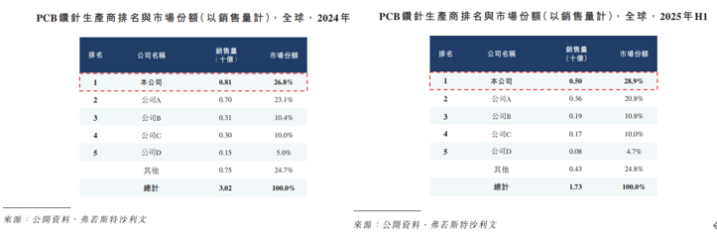 全球PCB钻针行业的市场集中度较高。据弗若斯特沙利文数据,按销售量计,鼎泰高科、中钨高新旗下深圳金洲精工、日本佑能、台湾尖点等全球前五大钻针生产商合计市场占有率超75%;其中,2024年、2025年上半年,鼎泰高科分别以8.1亿支、5亿支排名全球第一,米兰体育官网市场份额从26.8%增至28.9%。