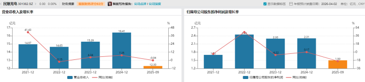 2023年、2024年,民爆光电营收分别是15.29亿、16.41亿元,分别同比增4.34%、7.35%;同期的归母净利润分别是2.3亿、2.31亿元,分别同比变动-6.22%、0.17%。进入2025年,该公司业绩开始下滑,营收、归母净利润分别同比跌0.04%、19.75%至12.3亿、1.5亿元。
