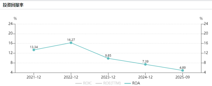 民爆光电上市后的投资回报率持续走低。Wind数据显示,2023年、2024年及2025年前9月,该公司投资回报率从9.85%跌至7.39%、4.89%。