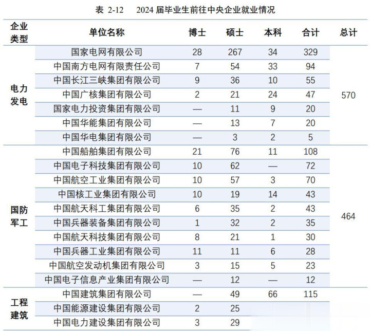 其中,国家电网有限公司以329人的录取人数强势领跑,学历梯队更是堪称完美:本科34人、硕士267人、博士28人,从基层到科研岗全面覆盖。中国建筑集团有限公司录取115人,中国船舶集团有限公司录取108人,中国南方电网有限责任公司录取94人,国企大厂对该校毕业生的青睐度不言而喻!