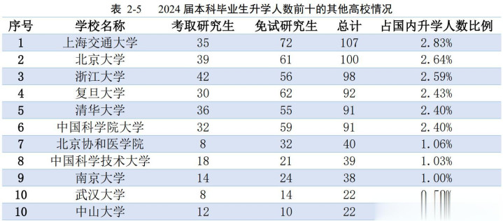 上海交通大学107人(含72人保研)、北京大学100人(含61人保研)、浙江大学98人(含56人保研)、复旦大学92人(含62人保研)、清华大学91人(含55人保研)、中国科学院大学91人(含59人保研)。保研名额占比极高,足以看出学校的硬实力有多能打!