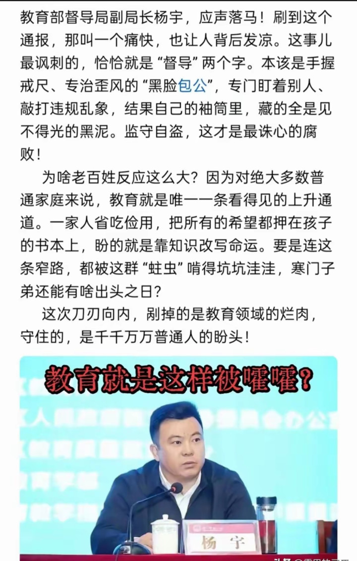 “官仓老鼠大如斗,见人开仓亦不走”,曹邺笔下的贪官形象,至今仍振聋发聩。杨宇被查不是终点,而是教育领域反腐的新起点。